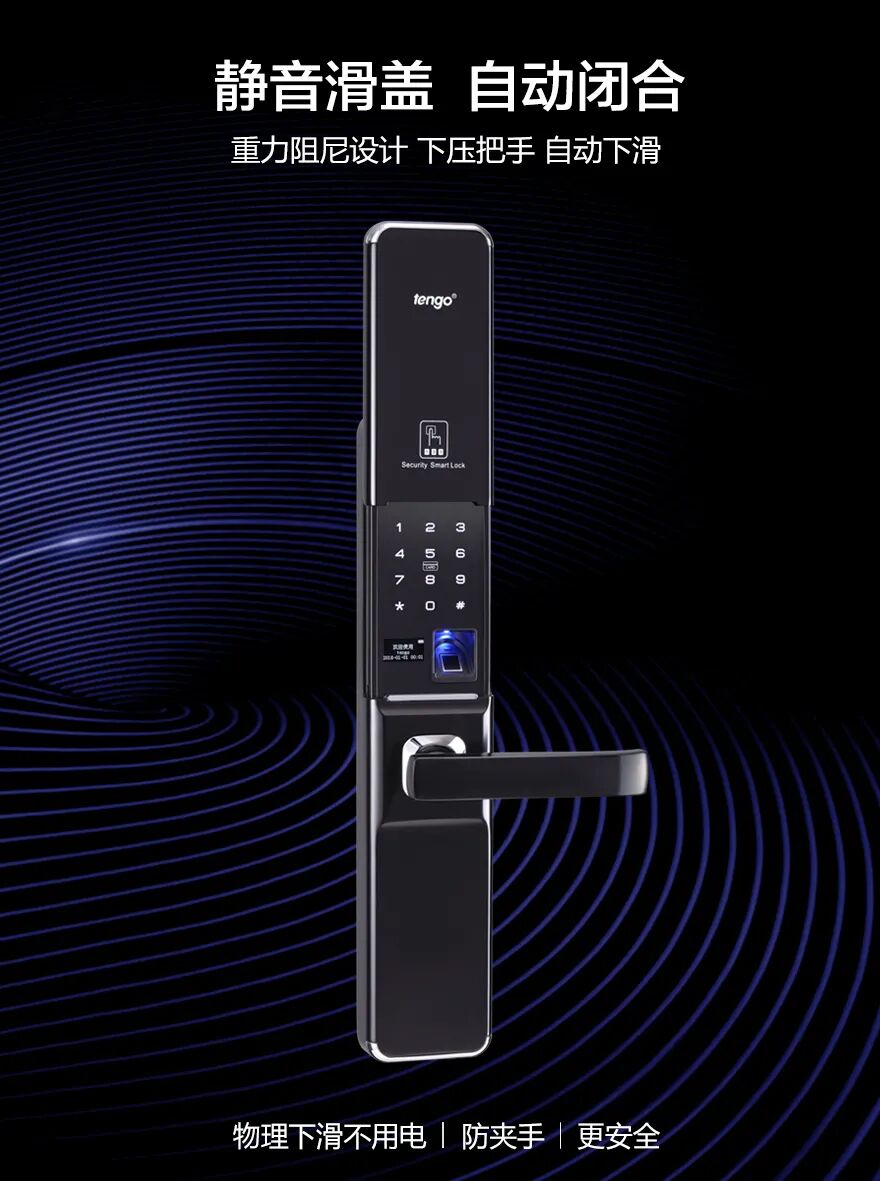 天固自主研发的专利产品,指纹/密码/卡片/钥匙/远程开门(选配)等多种开锁方式。多重防护功能,防撬报警、低电量报警、虚位密码功能。